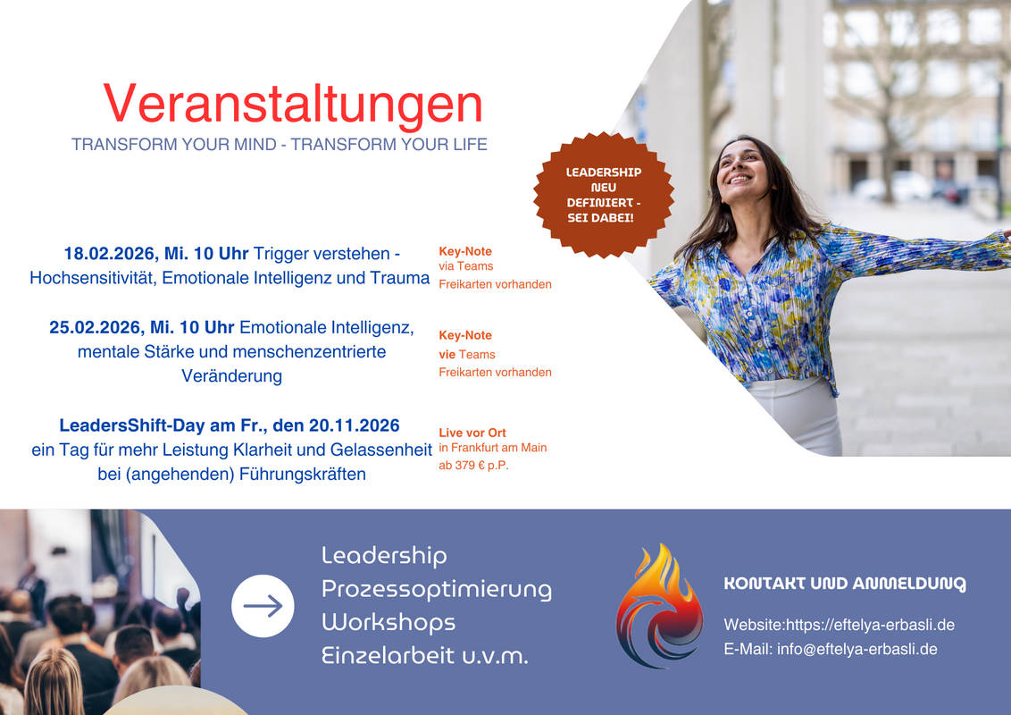 Lernen Sie die Deep-Dive-Sessions von Eftelya Erbasli kennen, die bereits über 500 Menschen – darunter 15 Unternehmer:innen, 75 Führungskräfte sowie 25 Selbstständige und ambitionierte Mitarbeitende – zu Höchstleistungen bei gleichzeitiger Gelassenheit begleitet hat.