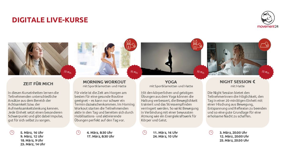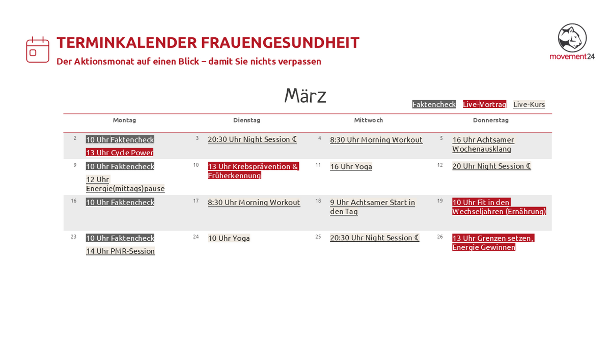 - Live-AngeboteLive-Vorträge zu den Themen: u.a. Zyklus, Krebsprävention sowie Ernährung in den Wechseljahren & mentaler Gesundheit. Live-Kurse u.a. mit Morning-Workout, Yoga und Entspannungseinheiten