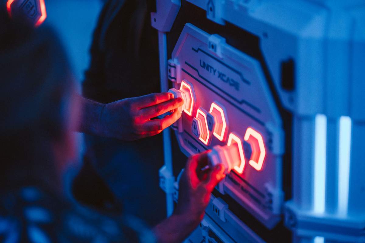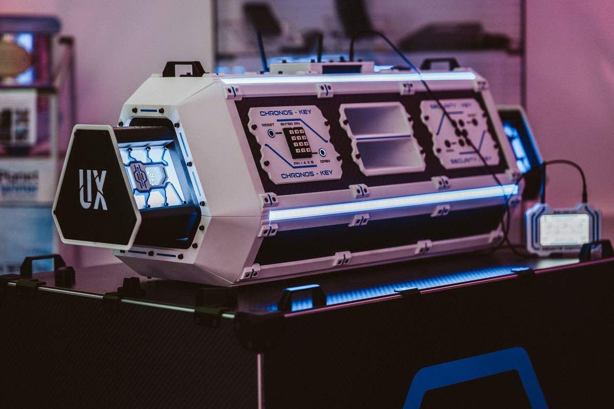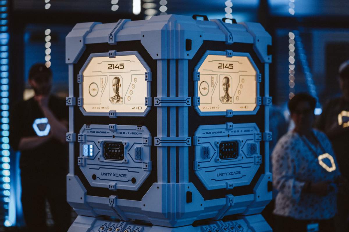 Die Zeitmaschine steht bereit – mitten in Ihrem Konferenzraum. „2145 Zeitreise" von Unity Xcape verwandelt jeden passenden Raum in eine filmreife Sci-Fi-Welt: über 5.000 LEDs, eine Zeitmaschine mit Hebemechanismus, interaktive Toolboxes mit versteckten Fächern und eine KI, die Ihr Team durch die Mission leitet.
