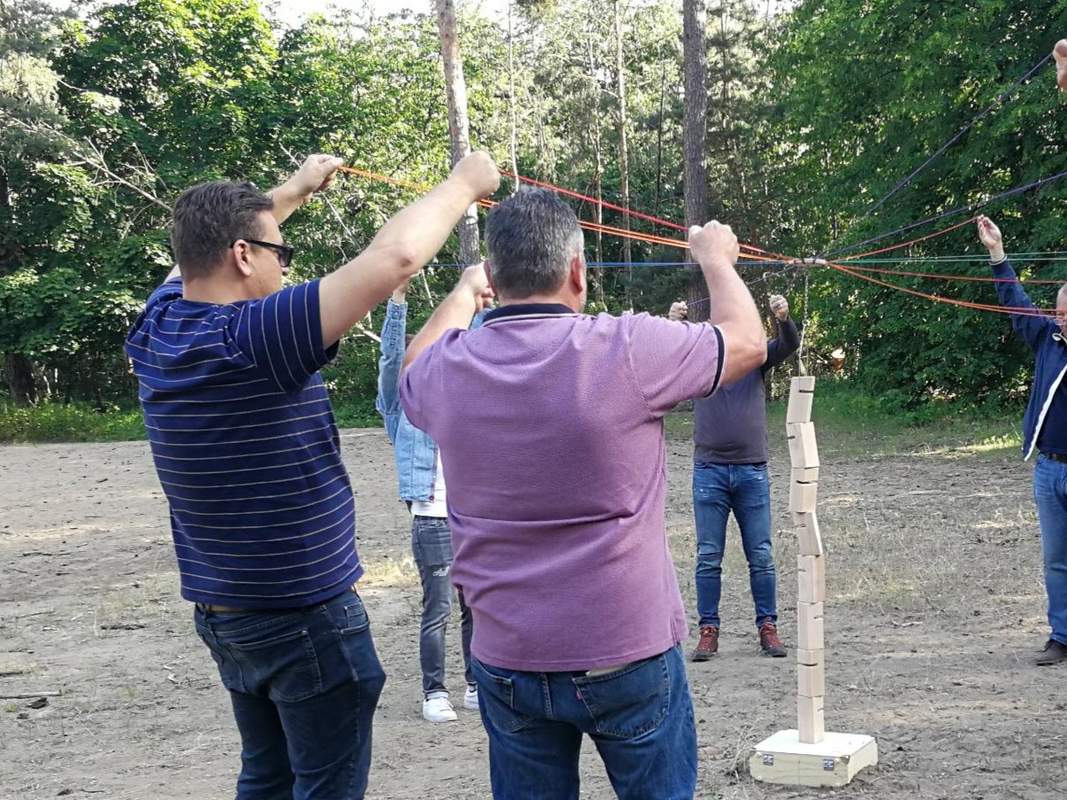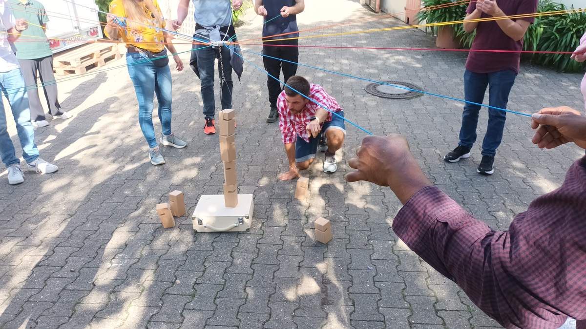 Auf einer Fläche verteilte Holzklötze wollen mit einem Kran aufeinander gestapelt werden. Dieser kann nur von allen Teilnehmenden gleichzeitig über Kordeln gesteuert werden. Communication is Key!