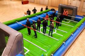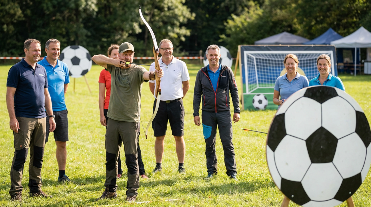 An bis zu 10 verschiedenen Stationen dürfen die Teilnehmer je nach Gruppengröße Schubsen, Werfen, Schieben und natürlich – wie auf die aufblasbare XXL-Dartscheibe – Schießen. Und beim klassischen Bogen- oder Lasergewehr-Schießen sind eben die Ziele eben fußball-rund.