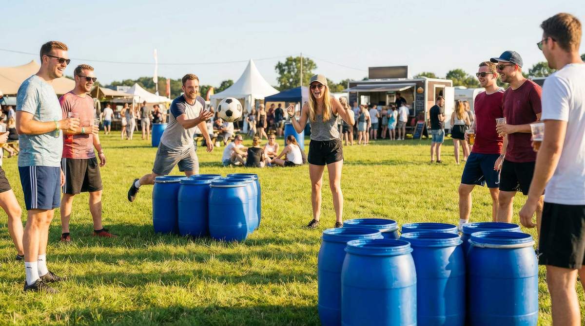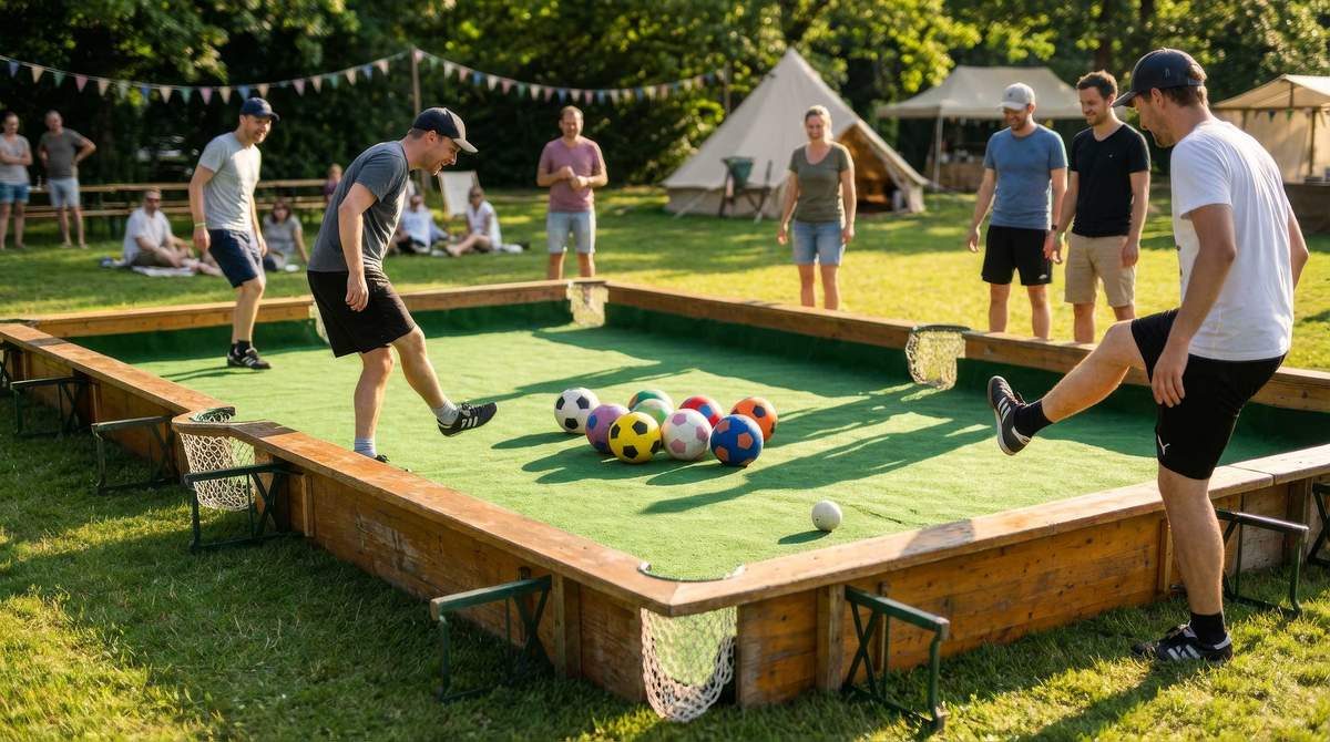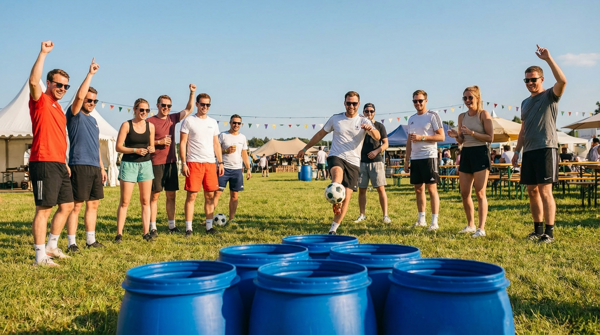 Bei der "Super-Summer-Soccer-Sause" (kurz: S-S-S-S) muss das Runde auch mal ins Billard-Netz, ins Beer Pong-Fass oder als Klett-Fuß-Ball sogar auf die 4 Meter hohe XXL-Dartscheibe.
