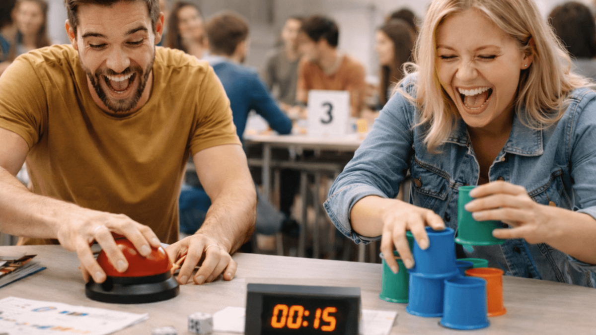 - Moderation & AblaufsteuerungKomplett geführtes Event inklusive Begrüßung, Einteilung in Zweier-Teams, Regelbriefing, Zeitmanagement, Buzzer-Wechsel und Abschlussmoderation.