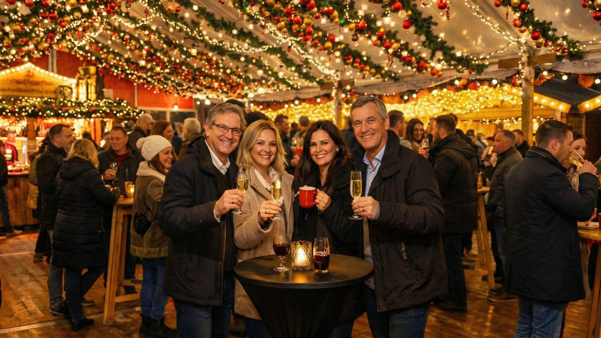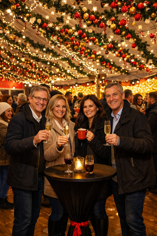 Für Gruppen ab 30 Personen bieten wir zwei besondere Erlebnisse: einen festlichen Glühwein-Empfang oder das Weihnachtsmarkt-Genusserlebnis – eine kulinarische Reise in winterlicher Atmosphäre. Freuen Sie sich auf ein unvergessliches Highlight für Ihr Team oder Ihre Kunden. Ohne Gedränge, ohne Stress, aber immer gemütlich bei jedem Wetter dank überdachter und beheizter Bereiche.