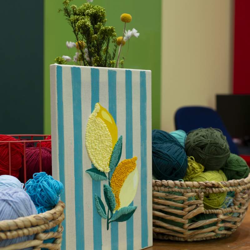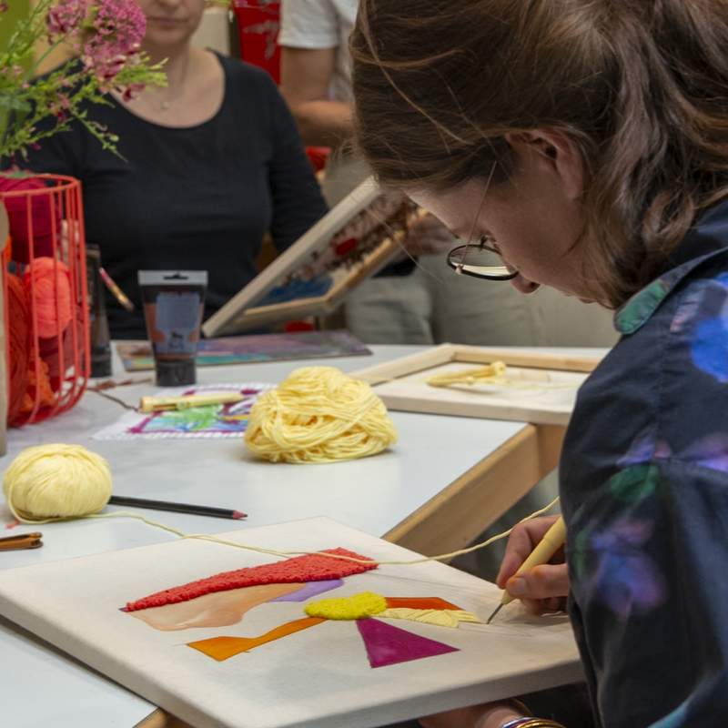 Erschafft haptische Kunst im Team! Wir verbinden die Trendtechnik Punch Needle mit Acrylmalerei auf Leinwand. Ein innovativer Workshop für Fokus und Entschleunigung, bei dem jeder ein hochwertiges Mixed-Media Unikat für das Büro gestaltet.