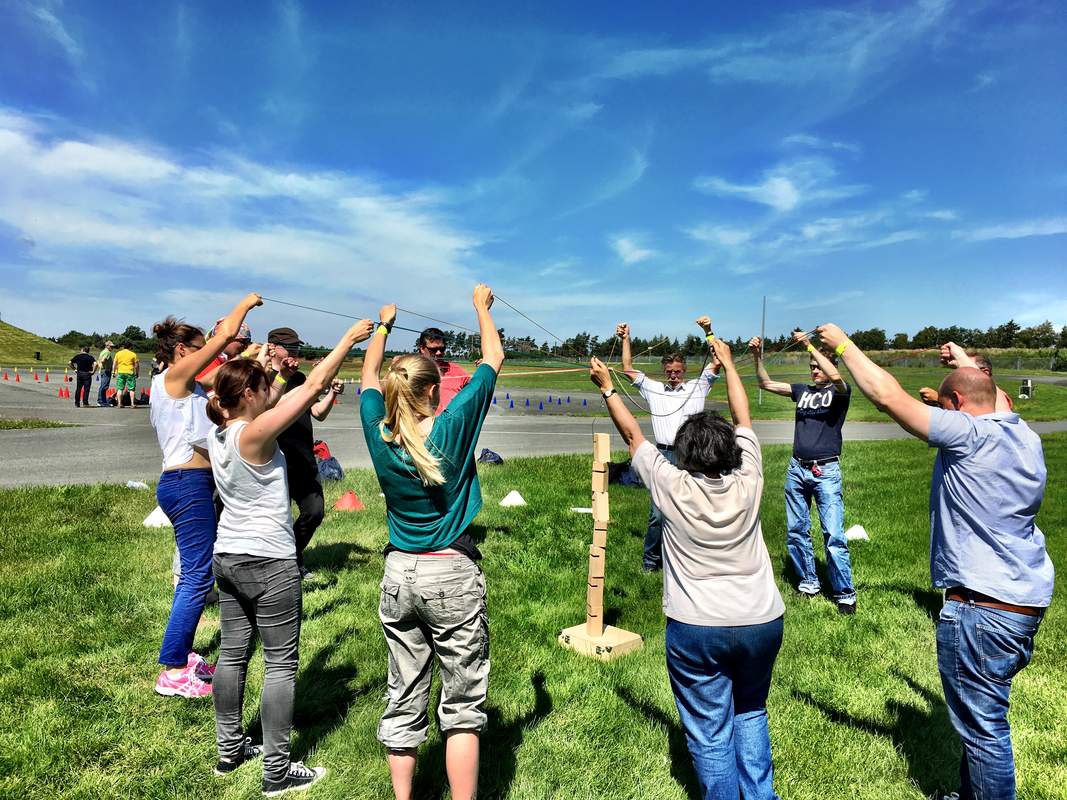 Nach einer herzlichen Begrüßung, einem Gruppenfoto und der Teameinteilung durch unseren Moderator starten die Teams an der Aktivstation Tower of Power. Dieses spannende Spiel fördert die Kommunikation und Kooperation innerhalb der Gruppe.