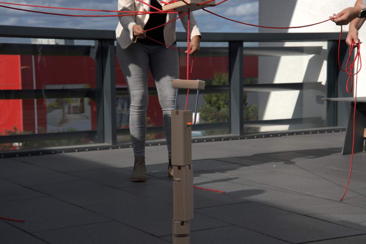 Über Seile steuert ihr gemeinsam als großes Team einen Fröbelturm, um Bausteine möglichst hoch aufeinander zu stapeln. Hier kommt es neben Ruhe und Geduld vorallem darauf an, Informationen klar weiterzugeben und sich schnell im Team abzustimmen, sonst wird das mit dem Turm nichts.