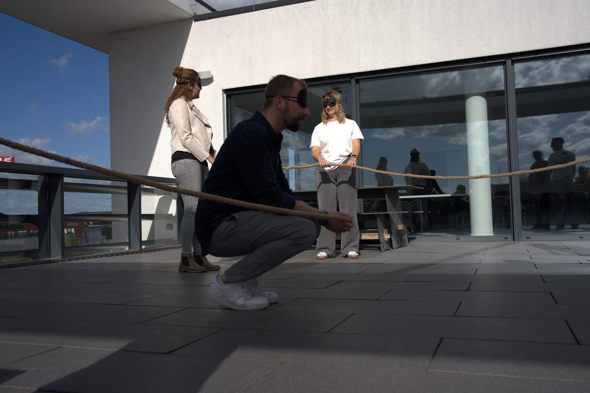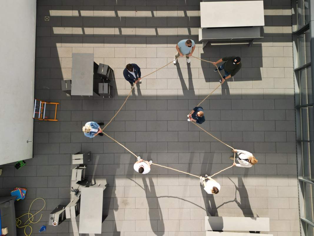 Hier formt ihr als Team eine vorgegebene geometrische Form aus einem Seil. Der Clou: Alle haben dabei die Augen verbunden. Die Aufgabe ist einfach und doch herausfordernd, denn nur über Sprache, gegenseitige Hinweise und gutes Zuhören müsst ihr gemeinsam die Form legen.
