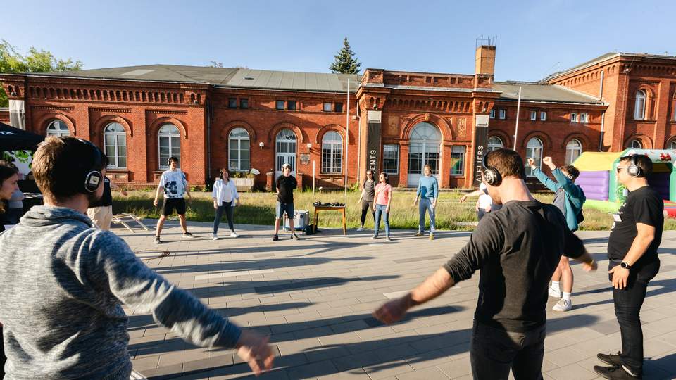 Die Radioballett-Praxis des Körperfunkkollektivs unterscheidet sich hiervon konzeptionell. Die Inszenierungen finden überwiegend im Kontext kuratierter Veranstaltungsformate statt, etwa auf Festivals, Konferenzen oder in Workshop-Settings. Der jeweilige Aufführungsort fungiert dabei weniger als Gegenstand kritischer Analyse denn als Rahmen für imaginative Erfahrungsräume. Über narrative Setzungen – beispielsweise futuristische Szenarien oder märchenhafte Erzählwelten – werden gedankliche Räume eröffnet, die durch die Vorstellungskraft der Teilnehmenden performativ ausgestaltet werden.