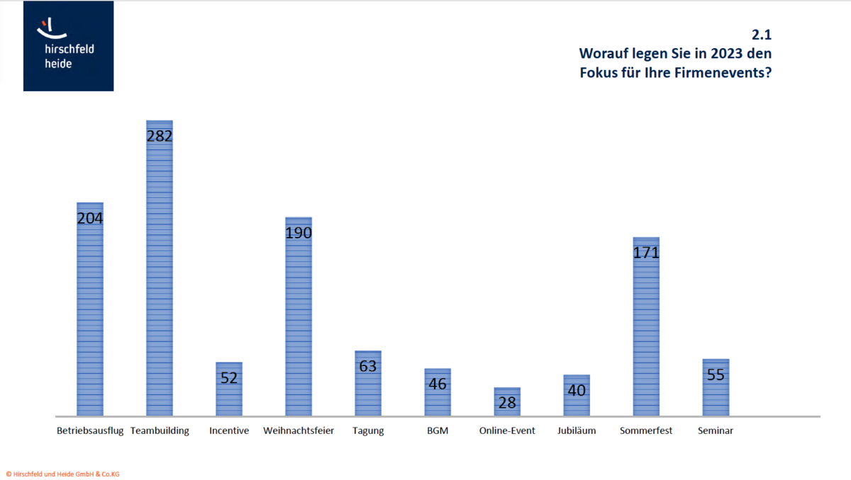 Die Umfrage ergab, das der Schwerpunkt von Firmenevents im Umfragejahr 2023, also kurz nach der Corona-Pandemie, auf Teamevents und Teambuilding-Events lag. 282 Stimmen wurden für diese Event-Art abgegeben. Rechnet man die Stimmen für die Firmen-Weihnachtsfeier, das Sommerfest und den Betriebsausflug auch im Umfeld von Teambuilding-Maßnahmen und Teamevents hinzu, so ergibt sich folgendes Bild: Deutsche Unternehmen aller Größenordnung setzen vermehrt auf Team-Events oder zumindest auf Firmenevents mit starkem Fokus auf die Mitarbeiter ( Tagungen und Seminare rangieren zumindest bei der befragten Zielgruppe abgeschlagen (63 bzw. 55 Stimmen). Bei dieser Fragestellung war eine Mehrfachnennung möglich.