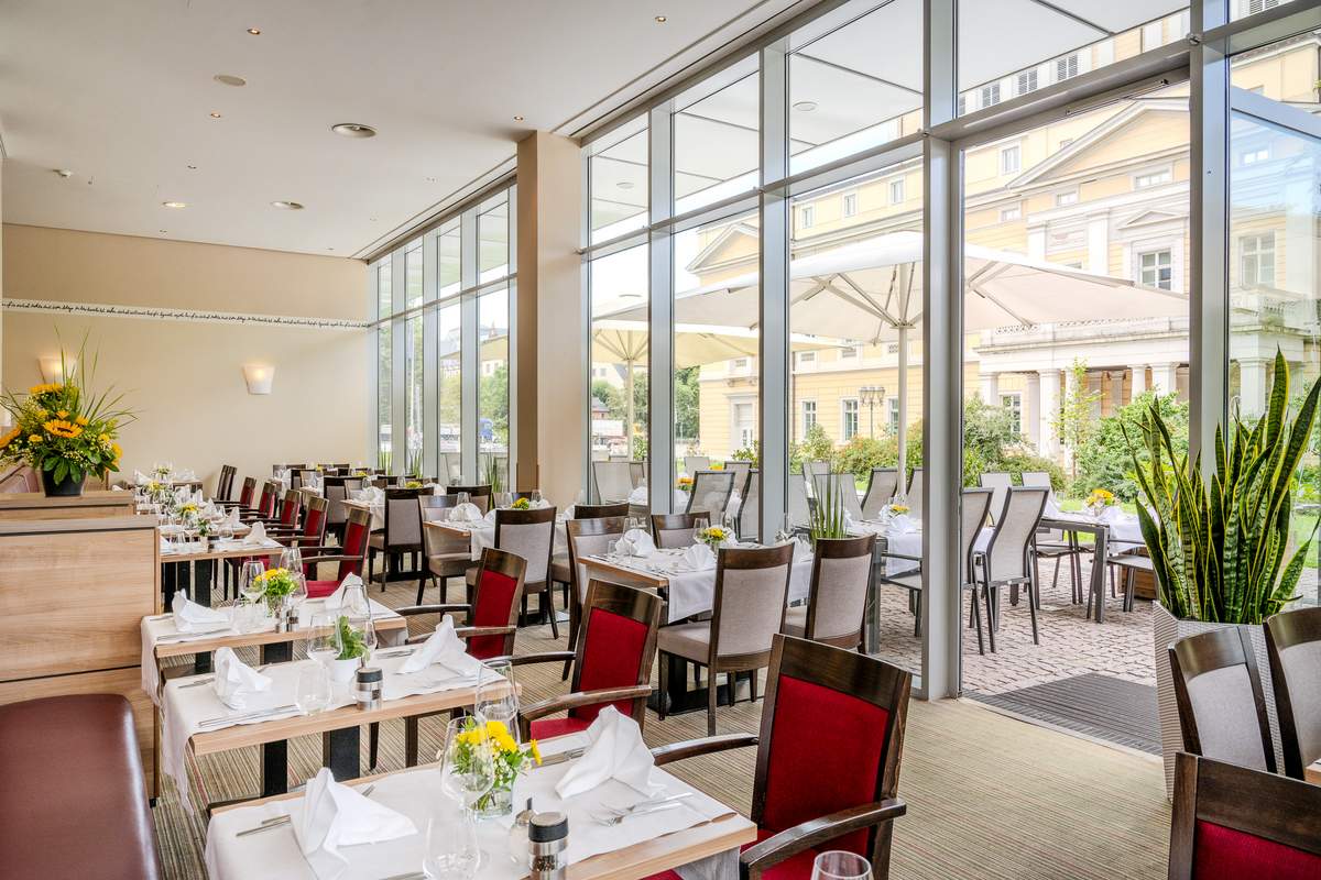 Das Restaurant „Herrngarten“ mit kalifornischer Küche und das Bistro „Moller“, in rustikalem Ambiente mit Snacks und regionalen Speisen, sorgen für kulinarischen Genuss. Die großzügige Sonnenterrasse ist eine Idylle im Grünen inmitten der Stadt und lädt mit Blick auf den Karolinenplatz zum Verweilen ein!