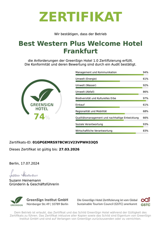 Das 4-Sterne Best Western Plus Welcome Hotel ist ein erstklassiges Businesshotel, zentral gelegen an der Frankfurter Messe. Geschäftsreisende wie Städtetouristen erwartet eine Kombination aus top-modernem Design und entspannter Wohlfühl-Atmosphäre. Der Blick auf die Frankfurter Skyline ist spektakulär, besonders vom Soft-Wellnessbereich im 7. Stockwerk. In den 173 Zimmern und Suiten, im Tagesrestaurant „View“ und der Bar „Melli’s“ mit Terrasse erwartet Sie 4-Sterne-Komfort vom Feinsten. In nur einer Minute Fahrzeit von der Autobahn und 10 Minuten von der Innenstadt entfernt, lassen sich alle Highlights der Stadt bequem erreichen.